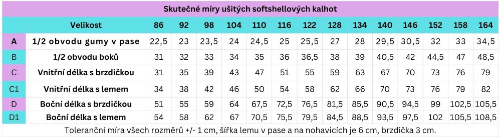 Softshellové kalhoty s bambusovým úpletem ušijeme i dle vlastních rozměrů. Pohodlný střih, který neomezuje v pohybu. Kalhoty mají v pase náplet ve kterém je volně vložená guma a otvor pro regulaci. Praktické kapsy a reflexní prvek na zadním dílu pro lepší viditelnost a bezpečnost. Zakončení nohavic si můžete vybrat ve dvou variantách, klasický lem nebo brzdičku. Materiál odolává větru i lehkému dešti - ideální volba pro aktivní děti na ven během podzimních a jarních dnů.